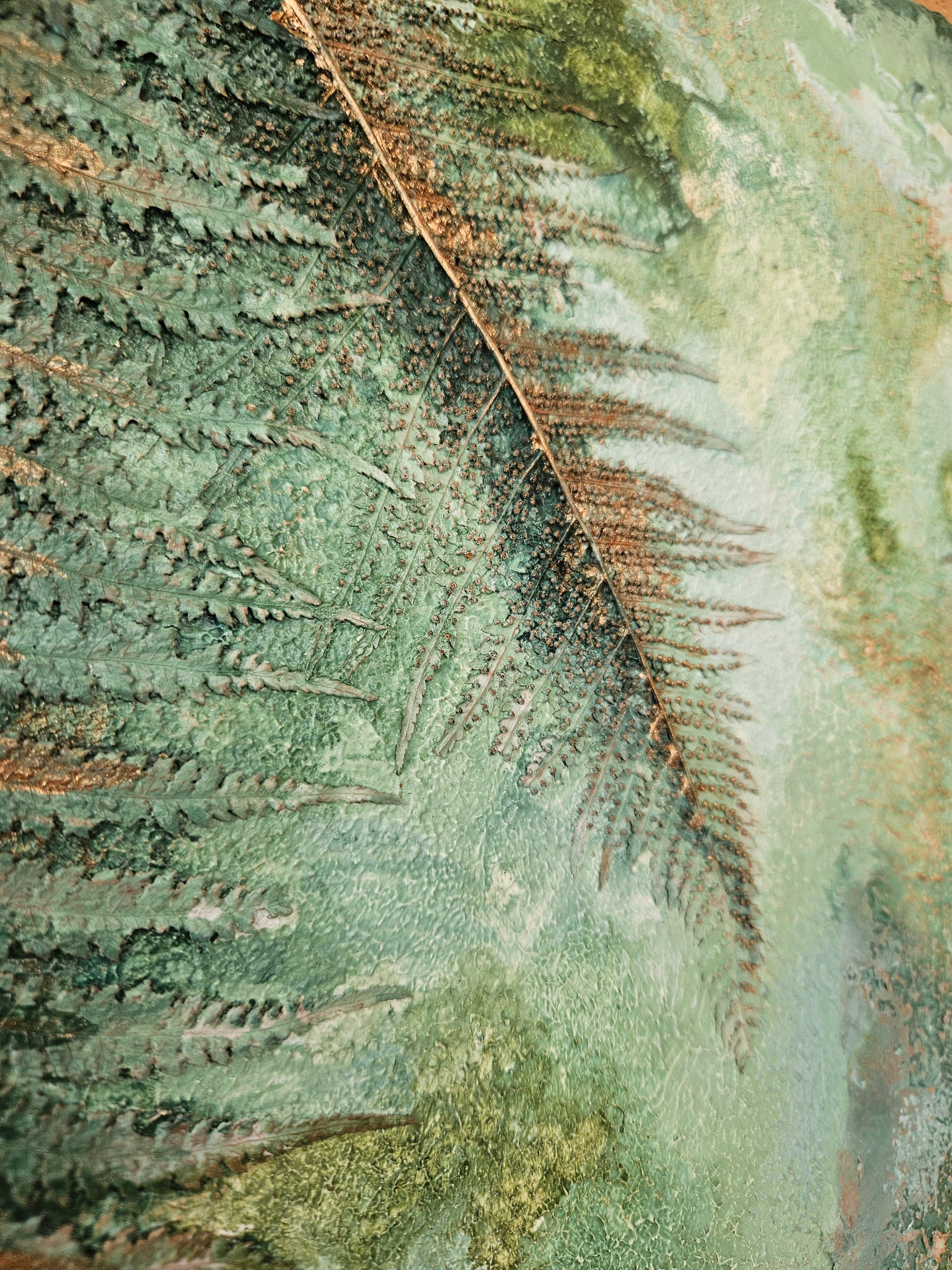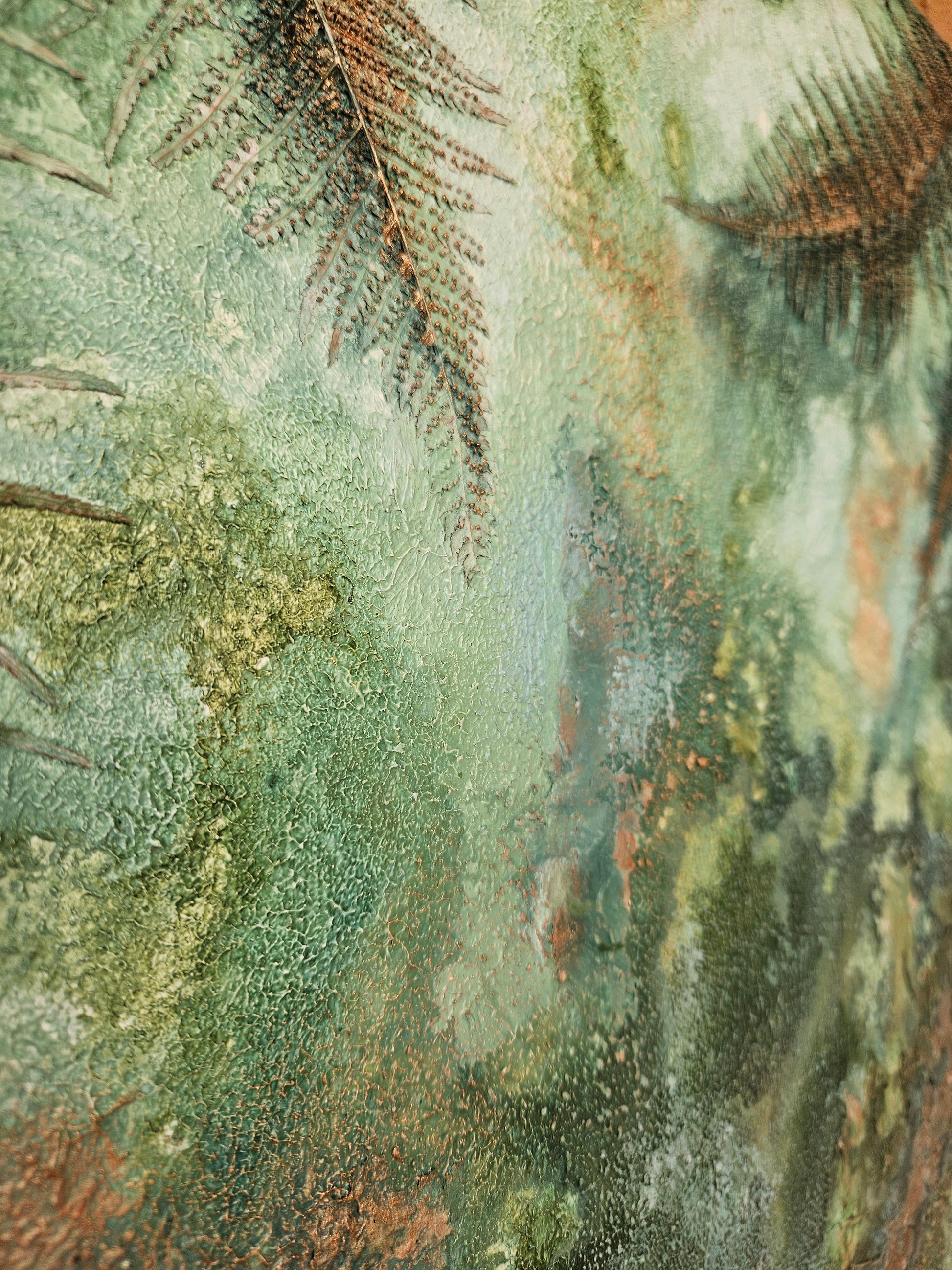 Mixed media, textured, abstract artwork on canvas.