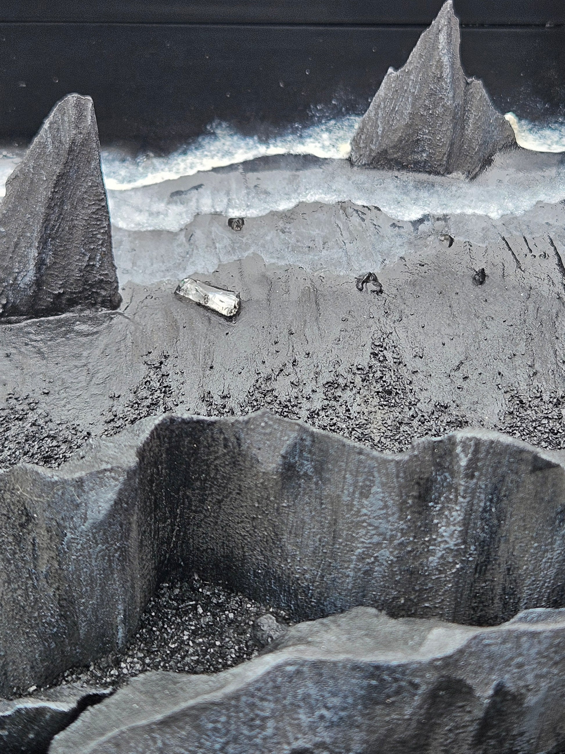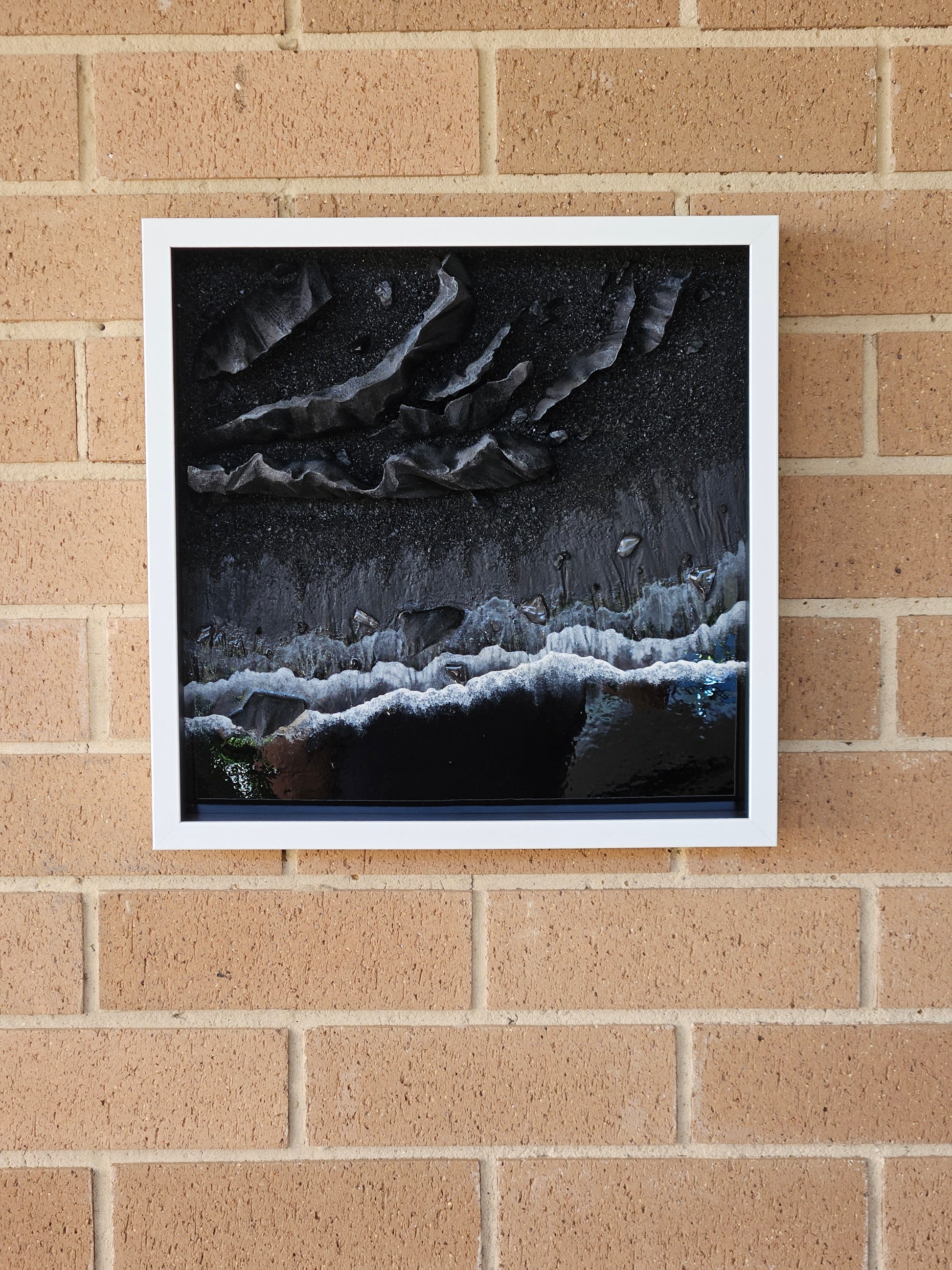 Framed mixed media textured artwork.
