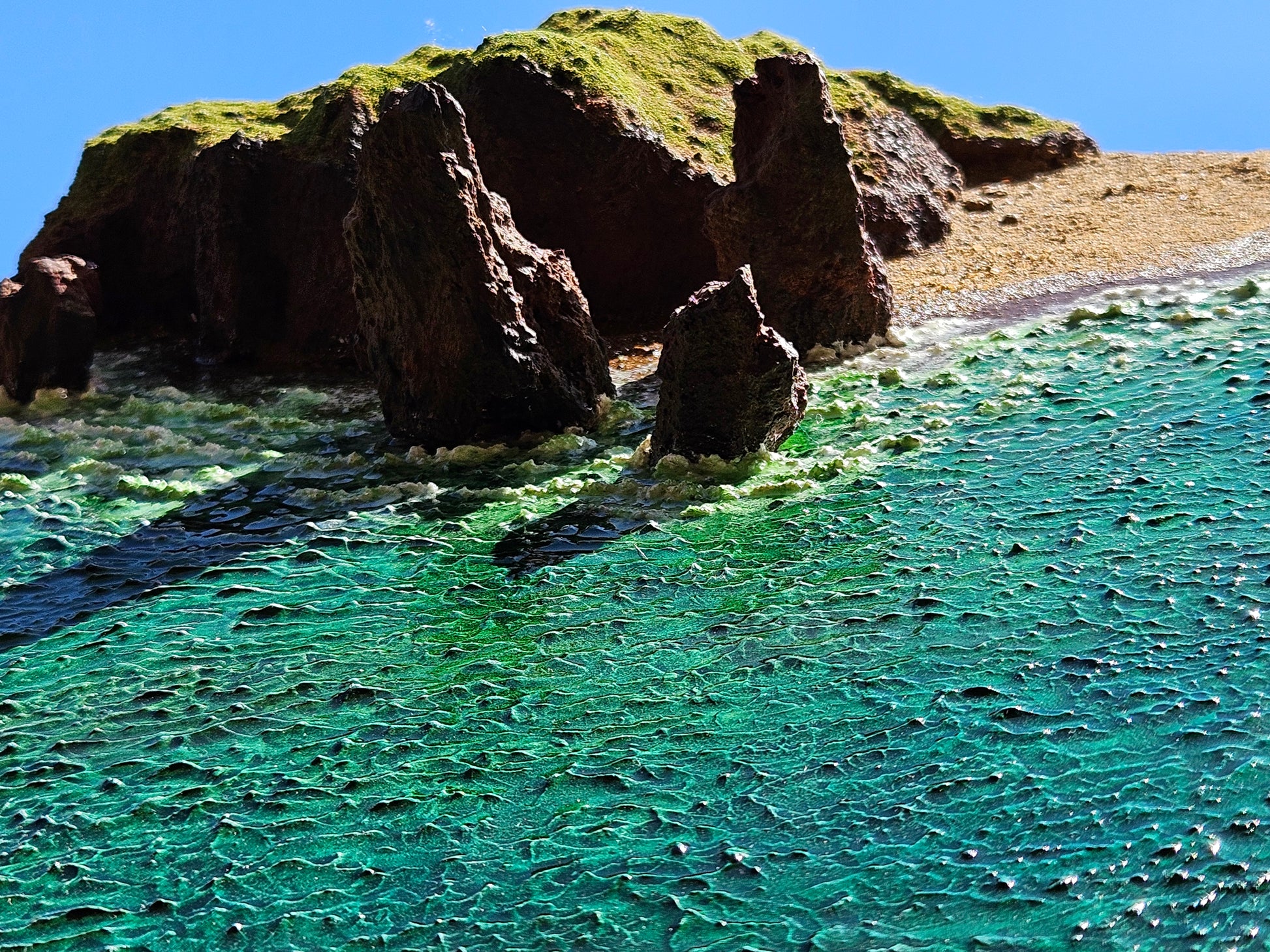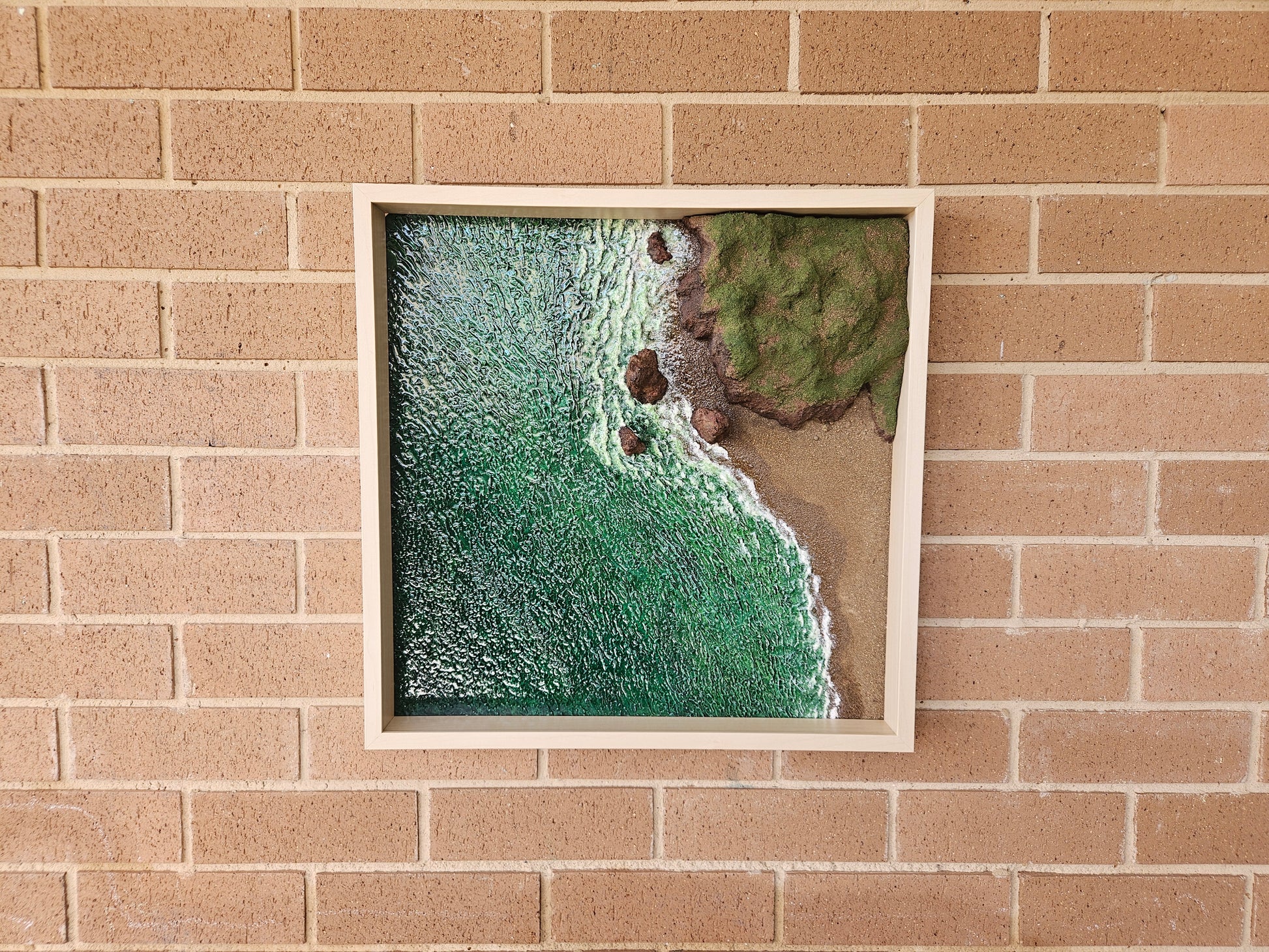 Framed mixed media textured artwork.